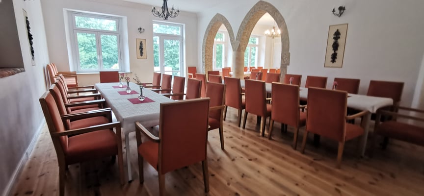 Wir bieten einen, durch zweifachen gotischen Torbogen geteilten, historischen "Gartensaal" von ca. 80 qm zur Vermietung an. Originale Ausstattungsmerkmale sind die Dielung von 1926, zahlreiche Halbreliefs aus Holz an den Wänden aus der Zeit des Realismus um 1870 und weitere Gestaltungsdetails wie gotische Fensternischen. Wand- und Deckenbeleuchtung sind nachempfunden und neuzeitlich. Rustikale Holzbestuhlung mit Armlehnen und Sitz- wie Rückenpolsterung inkl. Tische gestatten den Aufenthalt von ca. 48 Personen, bei reihenweiser Bestuhlung z.B. bei Vorträgen finden bis zu 60 Personen Platz. Ein kleines Podest in Stufenhöhe ist in einer Raumecke in Größe von 6 qm ausgeführt. Hier, wie an einem weiteren Standort, sind ausreichend Elektro- (inkl. 380V) und Datenanschlüsse installiert. Helle Wände und der Dielenboden schaffen eine warme Atmosphäre; drei große Fenster sorgen für reichlich Tageslichteinfall.
